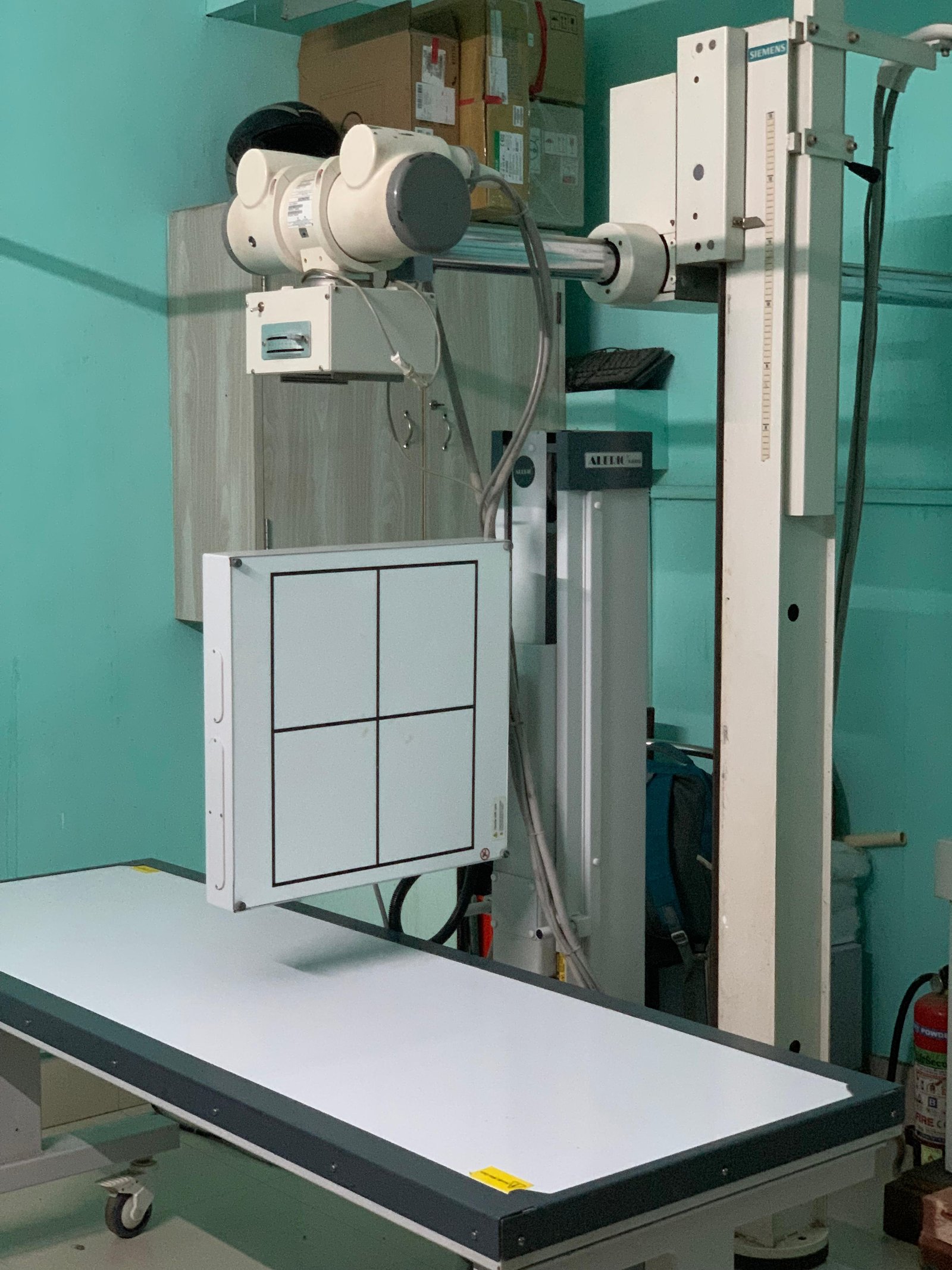 Our X-ray machine uses a small amount of ionizing electromagnetic radiation to create images of the inside of the body, which appear as black and white pictures on film or a digital detector. Dense materials like bone absorb more radiation, appearing white, while soft tissues and air appear as shades of gray or black. X-rays are used to diagnose conditions like fractures, infections (like pneumonia), tumors, and foreign objects.